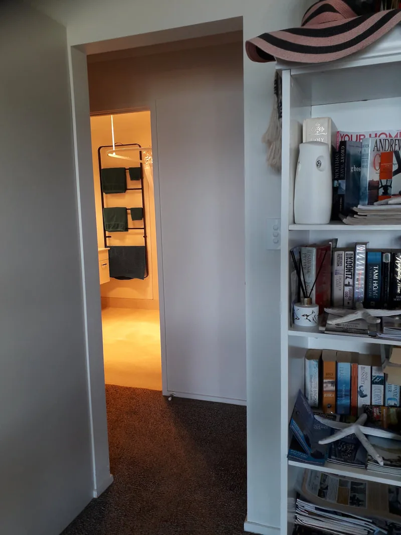 - Doorway opening from bedroom to hallway to bathroom (750W)