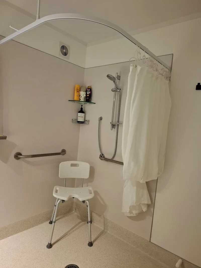 - 1 x Queen bed (bedroom with pocket doors). This bed can be moved to one side to accommodate easier access for a wheelchair. The measurement from the base of the bed to the carpet is 120H.