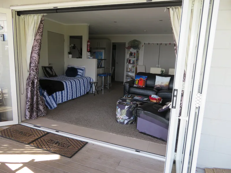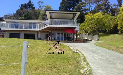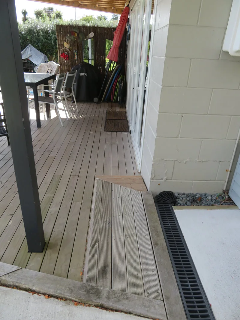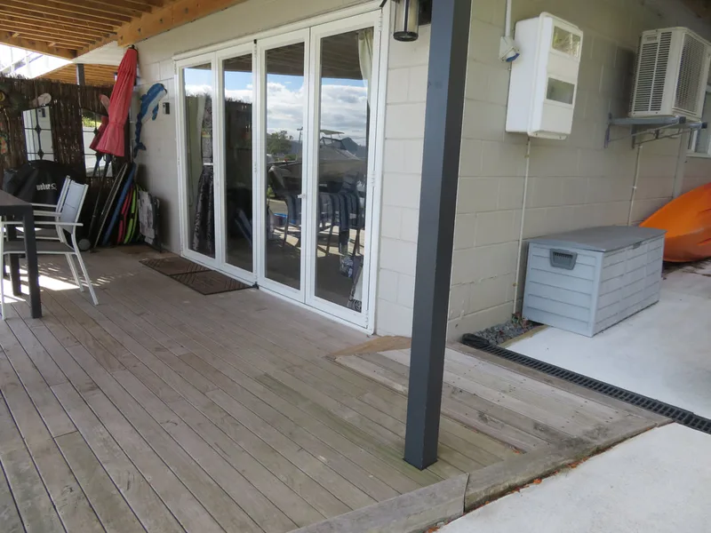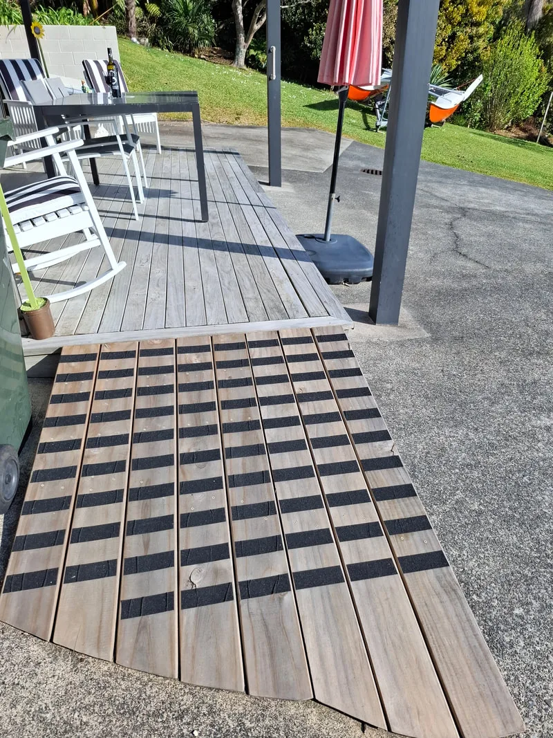 - The driveway from Whangarei Heads Road leads directly up to the dedicated car park next to the apartment. There is a ramp with a slight incline from the car park to the deck (see photos above). However, on the other side of the deck there is a proper ramp which is easier for a wheelchair (see photo with black anti slip stripes).